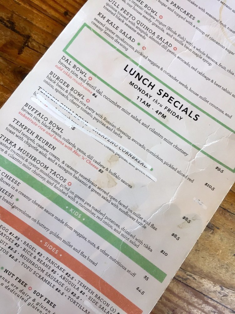 Great for kids 5 and under! 3 silver dollar pancakes, 1 scrambled egg or tofu, 1/4 avocado, 1 piece toast, fruit, and a single tempeh or sausage.