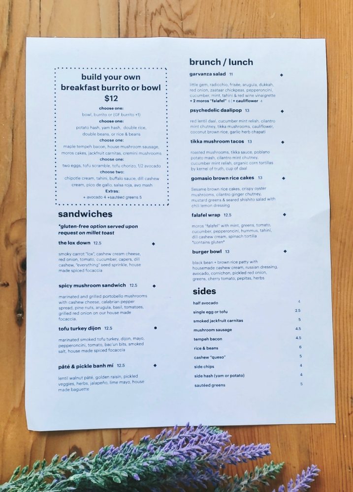 Baked beans, romas, mushrooms, 2 tempeh bacon strips, 2 veggie sausage patties, poblano pea mashers, and toast, with 2 eggs or tofu scramble. Nut free.